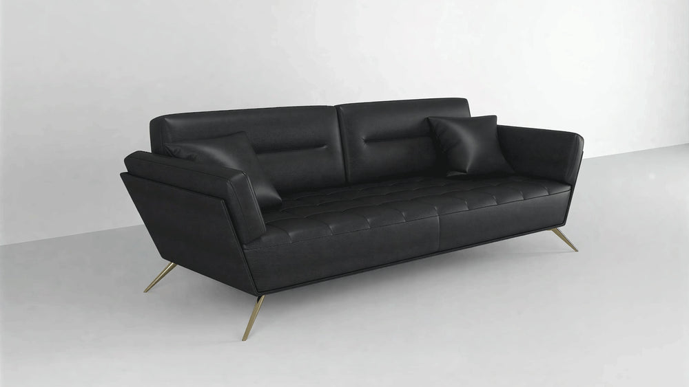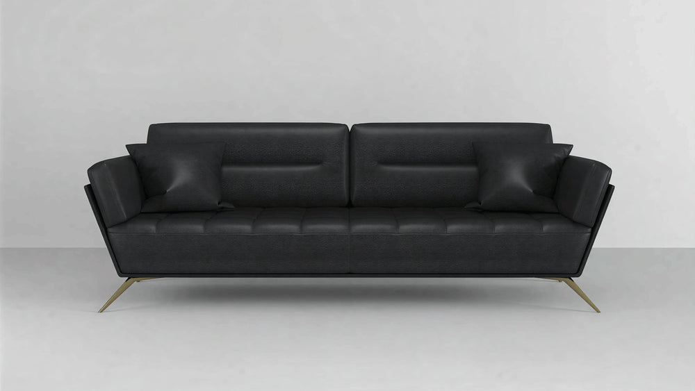 Elevate your living space with the centerpiece it deserves. Our Modern Black Leather Sofa masterfully blends timeless elegance with contemporary flair. Sink into the deep comfort of the hand-tufted cushions, expertly crafted for superior relaxation and lasting support. The sleek, premium black leather upholstery exudes sophistication, while the striking golden-toned legs provide a stunning visual lift, creating a perfect balance of luxury and modern design.