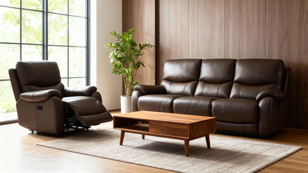 This reclining leather sofa set includes a 3-seater and two matching recliner armchairs, designed for ultimate comfort and relaxation. Upholstered in high-quality black leather, it offers a sleek, modern look with easy-to-use reclining features. Fully customizable to your preferences, choose from different configurations and finishes to perfectly complement your living space. Ideal for creating a sophisticated and cozy atmosphere in any home.